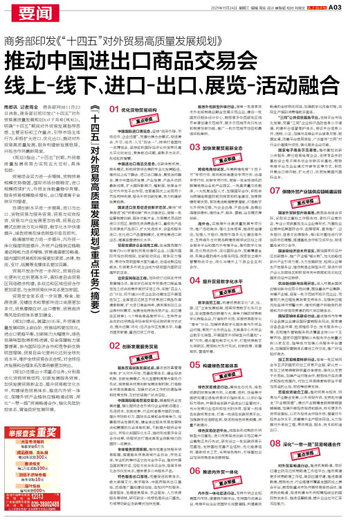 南都讯 记者周全 商务部网站11月23日消息,商务部日前印发《“十四五”对外贸易高质量发展规划》(以下简称《规划》),明确“十四五”期间对外贸易发展指导思想、主要目标和工作重点,引导市场主体行为,
