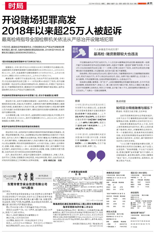 11月29日,最高检召开新闻发布会,介绍检察机关从严惩治开设赌场犯罪有关情况。据介绍,当前开设赌场犯罪呈高发态势,2018年至今年9月,检察机关已提起公诉98069件255850人。1至9月批捕设