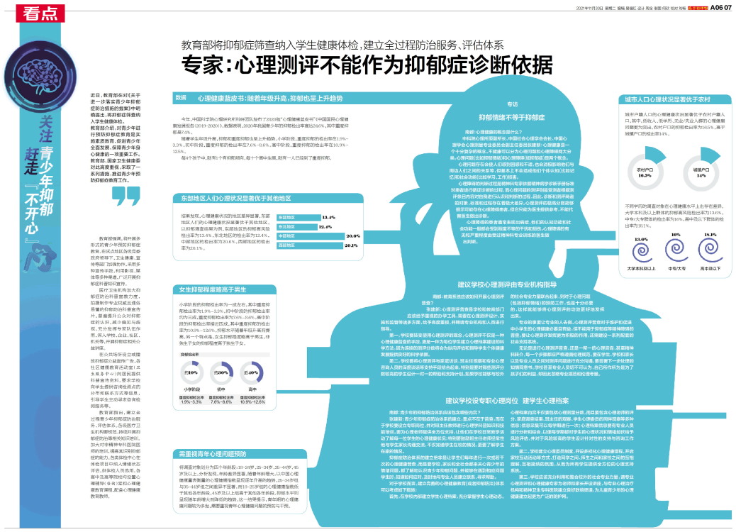 近日,教育部在对《关于进一步落实青少年抑郁症防治措施的提案》中明确提出,将抑郁症筛查纳入学生健康体检。教育部介绍,对青少年进行预防抑郁症教育是实施素质教育、促进青少年全面发展、保障青少年身心健康的