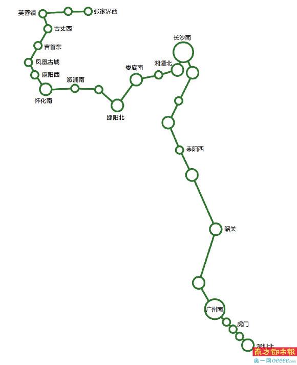 ◎除此之外,当日多趟列车分别是11:05、12:28、15:05、15:33和16:16发车,用时在6小时左右。其中,用时最短的一趟快车中间只停长沙南、怀化南和吉首东,广州南到张家界西只需5小时22分,这趟车二等座票价603.5元。
