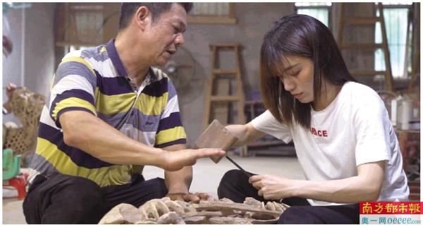 省级高级工艺美术师陈培希(左)指导女儿陈嘉制作潮州木雕。