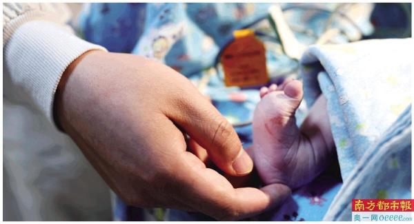 7月1日凌晨,在中国福利会国际和平妇幼保健院,一名爸爸在轻轻触碰刚刚出生的女儿的小脚。新华社发