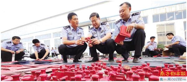 山东省枣庄市公安局市中分局民警,在分类清点破获的一起制贩假证团伙时收缴的假证、假公章等物品。 IC供图