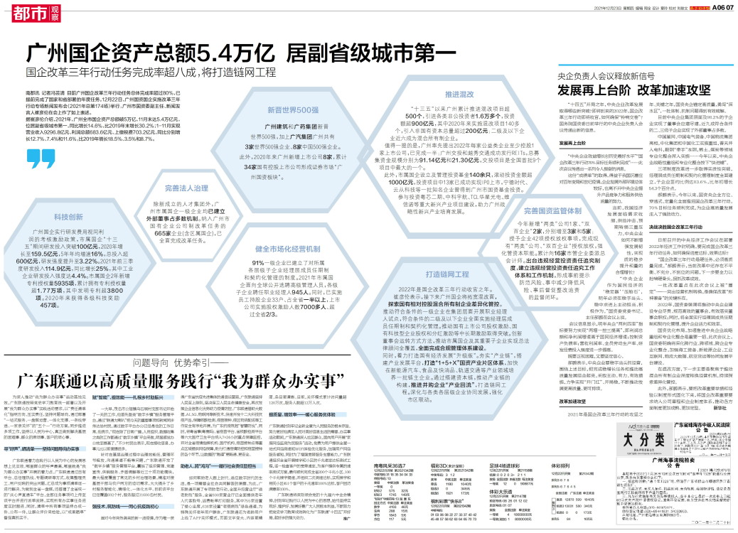 南都讯 记者冯芸清 目前广州国企改革三年行动任务总体完成率超过80%,已提前完成了国家和省部署的年度任务。12月22日,广州国资国企实施改革三年行动专场新闻发布会(2021年总第174场)举行,广