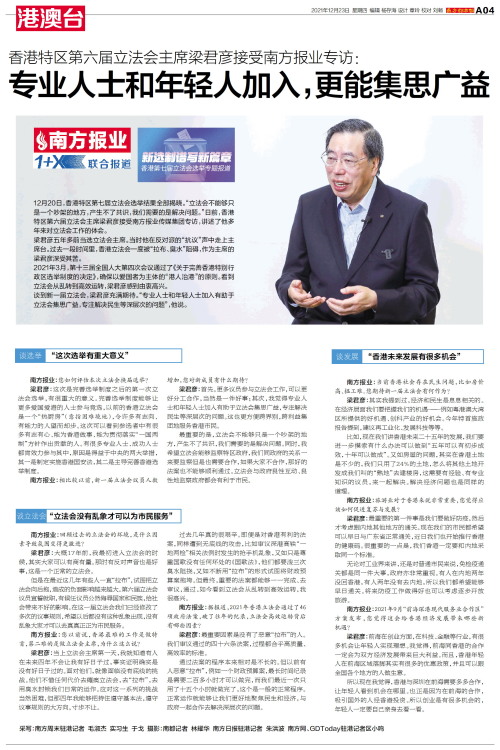 12月20日,香港特区第七届立法会选举结果全部揭晓。“立法会不能够只是一个吵架的地方,产生不了共识,我们需要的是解决问题。”日前,香港特区第六届立法会主席梁君彦接受南方报业传媒集团专访,讲述了他多