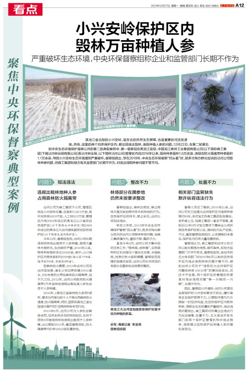 黑龙江省北部的小兴安岭,是东北的天然生态屏障,也是重要的河流发源地。然而,这里的两个自然保护区内,都出现违法毁林、违规种植人参的问题。12月22日,在第二轮第五批中央生态环境保护督察公开的第二批典型案例中,第一督察组在黑龙江发现,中国龙江森林工业集团有限公司(以下简称森工集团)下属沾河林业局有限公司(原沾河林业局,以下简称沾河公司)管理区内自2016年以来,毁林种参面积1.6万余亩,违规在防火隔离带种参面积1.1万余亩,导致小兴安岭生态环境遭到严重破坏。督察组指出,早在2018年,中央生态环保督察“回头看”时,就多次转办群众投诉的沾河公司毁林种参问题,但森工集团和地方有关监管部门长期不作为,对违法违规种参问题不管不问。