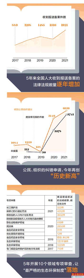 南都记者梳理5份报告发现,2020年全国人大常委会法工委收到的公民、组织提出的备案审查建议相对前年激增,高达5146件;今年收到了6339件建议,再创历史新高。