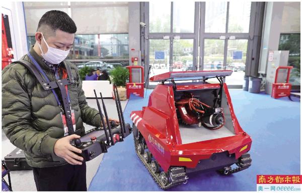 现场工作人员介绍,该款消防机器人应用了一整套耐高温系统性技术,包括耐高温防护技术,包括耐高温运动底盘、耐高温环境传感检测技术等,这些技术赋予了机器人在没有外部辅助降温的情况下,在1000℃高温环境中持续工作30分钟以上的能力,可以解决消防机器人无法进入火场高温核心区域的痛点。