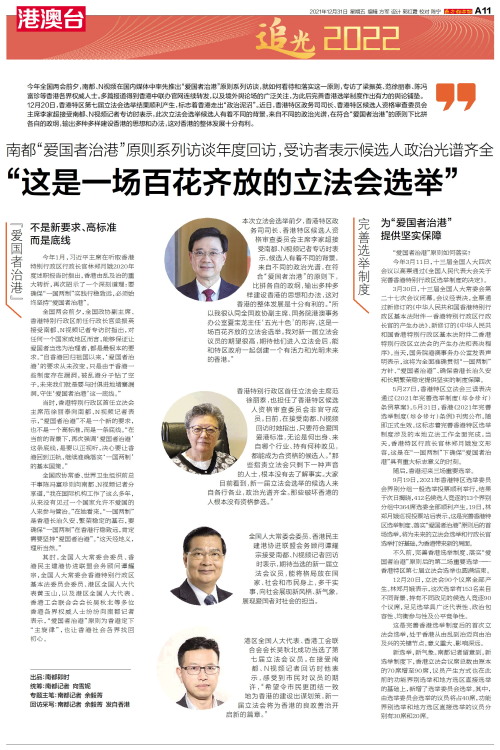 今年全国两会前夕,南都、N视频在国内媒体中率先推出“爱国者治港”原则系列访谈,就如何看待和落实这一原则,专访了梁振英、范徐丽泰、陈冯富珍等香港各界权威人士。多篇报道得到香港中联办官网连续转发,以及