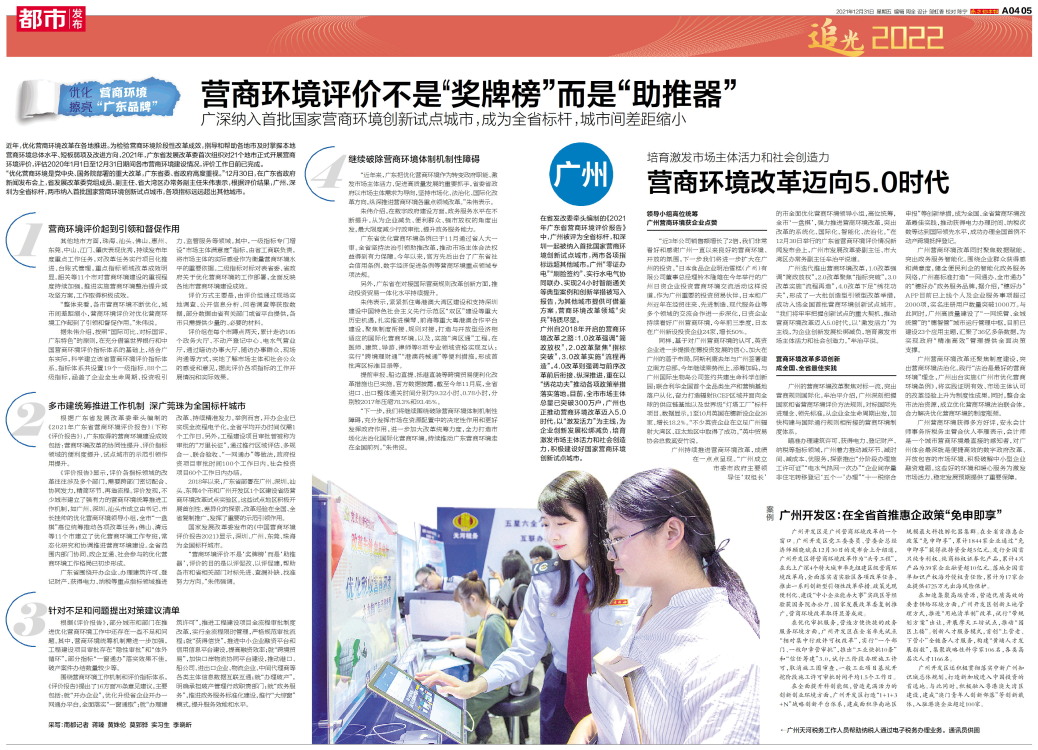 广州 在省发改委牵头编制的《2021年广东省营商环境评价报告》中,广州被评为全省标杆,和深圳一起被纳入首批国家营商环境创新试点城市,两市各项指标远超其他城市。广州“零证办电”“刷脸签约”、实行水