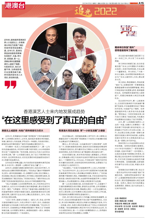 近年来,越来越多香港演艺界人士选择北上,在粤港澳大湾区乃至更广阔的内地市场寻找发展机遇。去年5月,香港完善选举制度条例草案生效前夕,王晶、李力持、梁竞徽、黄一山、汤镇业等8位爱国爱港艺人接受了南都、N视频专访,他们步履不停,为两地影视行业发展贡献力量,呼吁更多青年深入大湾区,抓住新机遇。