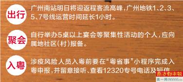出行 广州南站明日将迎返程客流高峰,广州地铁1、2、3、5、7号线运营时间延长1小时。 聚会 自行举办5桌以上宴会等聚集性活动的个人,应向属地社区(村)报备。 入粤 涉疫风险人员入粤前要在“粤省事”小程序完成入粤申报,并留意接听、查看12320专号电话及短信。
