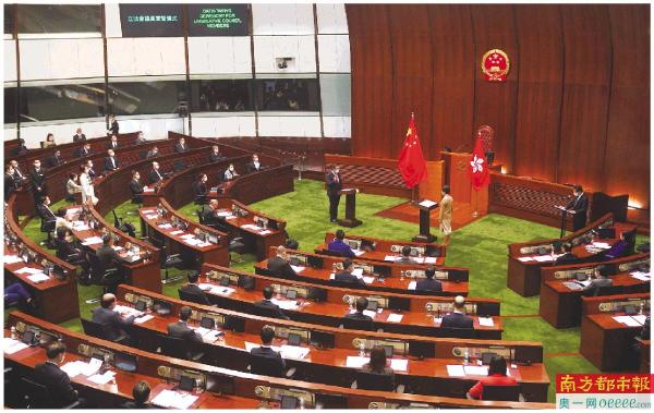 这是香港特区完善选举制度后产生的首届立法会,也是特区行政长官首次作为立法会监誓人。当日的立法会综合大楼会议厅,国徽第一次高悬主席台上方,下方分别竖立着国旗与区旗,宣誓席与监誓席相向而立,阳光透过穹顶,照耀这个神圣场合。