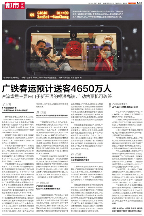 南都记者从中国铁路广州局集团有限公司(以下简称广铁集团)获悉,今年春运40天预计发送旅客4650万人,同比增加587.2万人,增长14.5%。今年客流的增量主要来自赣深高铁的开通。