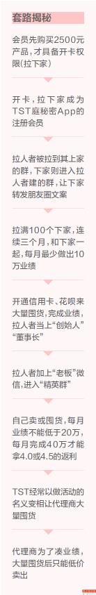 TST前代理商李月告诉南都记者,她在2016年就开始代理TST,在2021年年初离开时,已经做到“董事长”级别。李月回忆,2016年刚加入时,她连发了两天朋友圈对产品进行推广,之后她的上级告诉她,光做零售不挣钱,得“开卡”。所谓“开卡”,也就是让他人成为TST庭秘密App的注册会员。“这样他买东西你有钱赚,他再介绍朋友‘开卡’,你还有钱赚。”