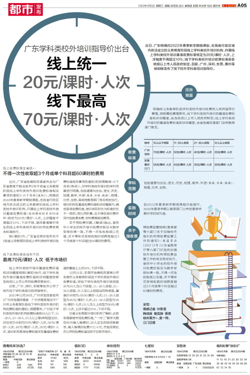 近日,广东明确自2022年春季新学期授课起,在我省行政区域内依法成立的义务教育阶段线上学科类校外培训机构,开展线上学科类校外培训基准收费标准核定为20元/课时·人次,上浮幅度不得超过10