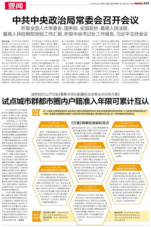 新华社电 中共中央政治局常务委员会1月6日全天召开会议,听取全国人大常委会、国务院、全国政协、最高人民法院、最高人民检察院党组工作汇报,听取中央书记处工作报告。中共中央总书记习近平主持会议并发表重