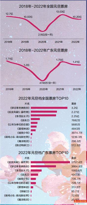 从2018年到2022年的广东元旦票房来看:2018年1.71亿,2019年1.2亿,2020年4746万(仅一天),2021年1.75亿,2022年1.41亿,广东今年的元旦票房与全国元旦票房走势一致,近五年来也是排第三,整体走势下滑。