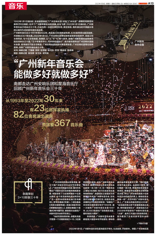 广州新年音乐会篇 从1993年至2022年30年来 有23位指挥家执棒 82位客席演出嘉宾 共演奏367首乐曲 1993年1月1日晚8时,友谊剧院响起了广州交响乐团(时称“广州乐团”)演