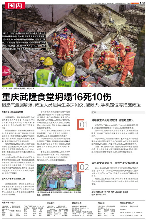 1月7日12时10分,重庆市武隆区凤山街道办事处食堂发生坍塌造成人员被困,疑似食堂燃气泄漏燃爆。1月8日上午,应急管理部官网通报称,经过全力搜救,7日23时许,最后一名被困人员获救生还,共搜救出26名被困人员,其中16人死亡、10人受伤。国务院安委会决定,对该起事故查处实行挂牌督办。