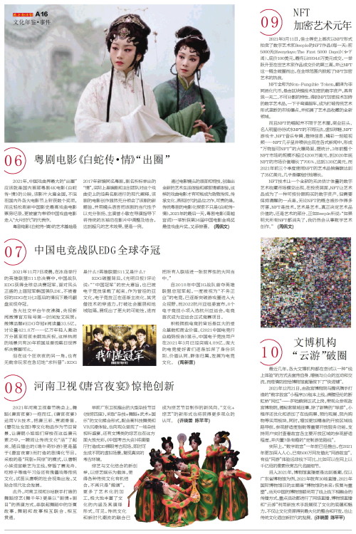 通过电影镜头的语言和特技,创造出全新的艺术生活体验和感官情感体验,这样的戏曲电影才有可能成为致敬传统、传承文化、表现时代的品位之作。可贵的是,传统粤剧的电影化探索不只是《白蛇传·情》,2021年的最后一天,粤剧电影《南越宫词》一举斩获第34届中国电影金鸡奖最佳戏曲片奖,又添惊喜。 (周佩文)