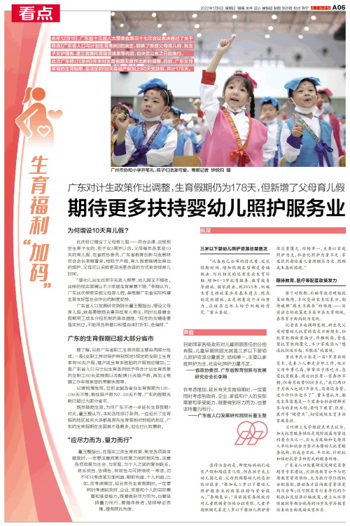 去年12月1日,广东省十三届人大常委会第三十七次会议表决通过了关于修改《广东省人口与计划生育条例》的决定,明确了新增父母育儿假、独生子女护理假,建立普惠托育服务体系等内容,自决定公布之日起施行。