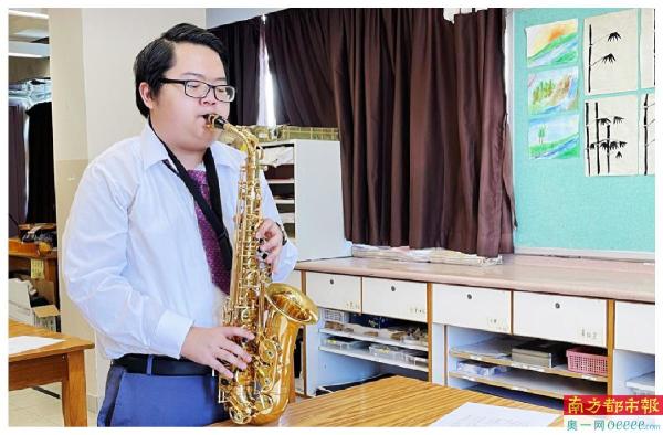 1. 赖伟聪正在练习吹奏萨克斯管。