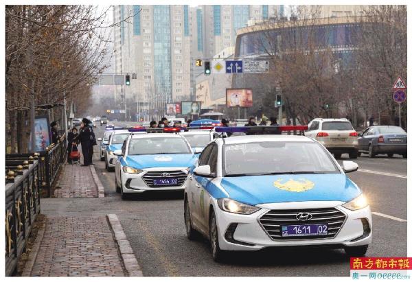 1月7日,警车在哈萨克斯坦阿拉木图街头巡逻。