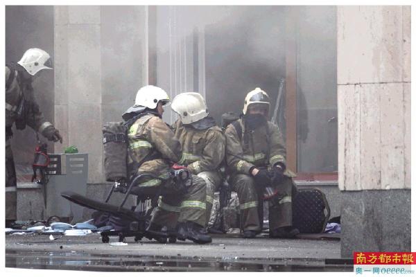 1月7日,消防员在哈萨克斯坦阿拉木图给建筑灭火的间隙休息。