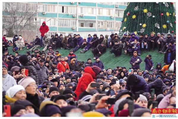 1月4日,民众在哈萨克斯坦阿克套市中心广场集会,抗议液化天然气涨价。