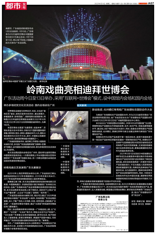 南都讯 广东省政府新闻发布会1月5日消息称,1月10日,广东将承办2020迪拜世博会中国国家馆日的文艺演出活动,1月11日至13日,将以线下和线上相融合的方式举办广东活动周。 举办多场经贸文化交