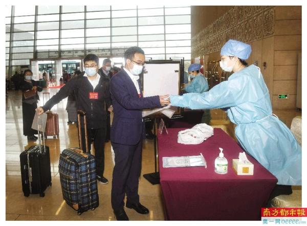省两会报到处,代表们亮码、做核酸,领取证件和相关资料。