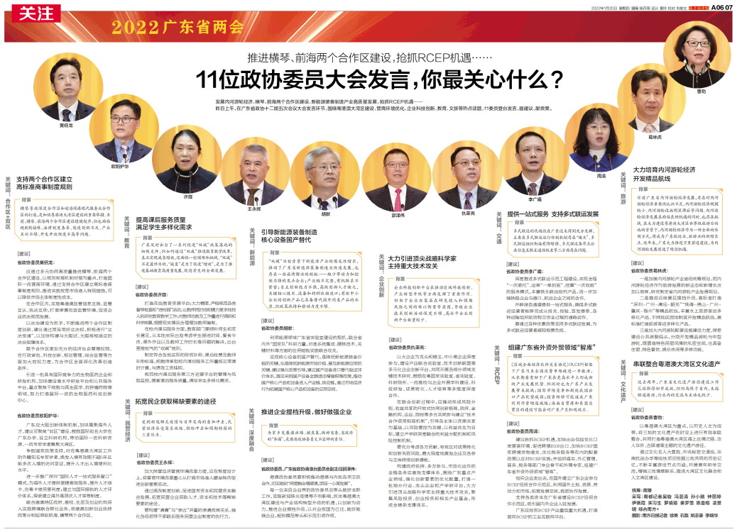 发展内河游轮经济,横琴、前海两个合作区建设,新能源装备制造产业高质量发展,抢抓RCEP机遇…… 昨日上午,在广东省政协十二届五次会议大会发言环节,围绕粤港澳大湾区建设、营商环境优化、企业科技创新