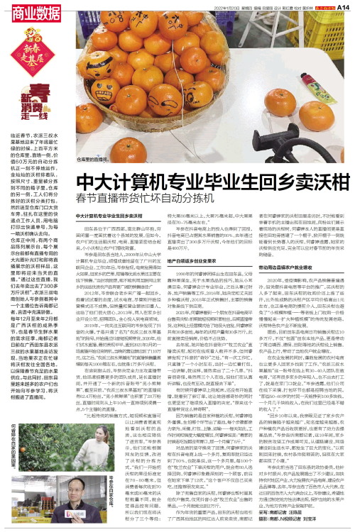 临近春节,农派三叔水果基地迎来了年底最忙碌的时候。上百平方米的仓库里,靠墙一侧,价值60万元的自动分拣机正一刻不停地运作,金灿灿的沃柑排着队,按照尺寸、重量被分拣到不同的箱子里。仓库的另一侧,工人