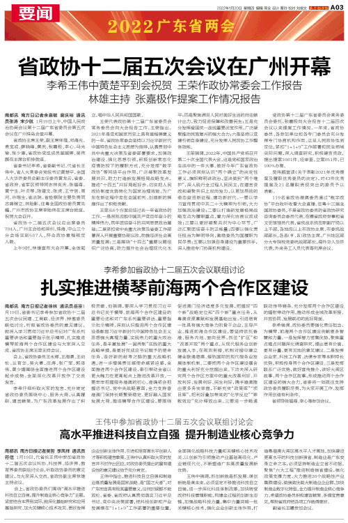 南都讯 南方日报记者吴哲 李凤祥 通讯员符信 1月19日,代省长王伟中参加省政协十二届五次会议科协、科技界、经济界、教育界委员联组讨论会,听取政协委员的意见建议,与大家深入交流。省政协副主席林雄主