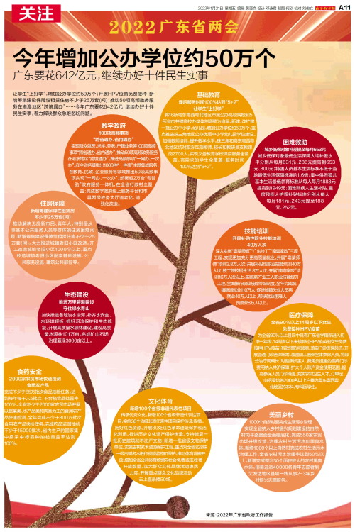 让学生“上好学”,增加公办学位约50万个;开展HPV疫苗免费接种;新增筹集建设保障性租赁住房不少于25万套(间);推动50项高频政务服务在港澳地区“跨境通办”……今年广东要花642亿