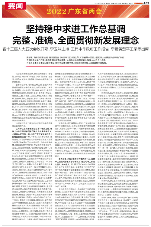 南都讯 南方日记者姚瑶 通讯员任宣 2022年1月20日上午,广东省第十三届人民代表大会第五次会议在广州白云国际会议中心开幕。根据疫情防控工作需要,大会设省主会场和深圳、珠海、中山3个分会场。开幕