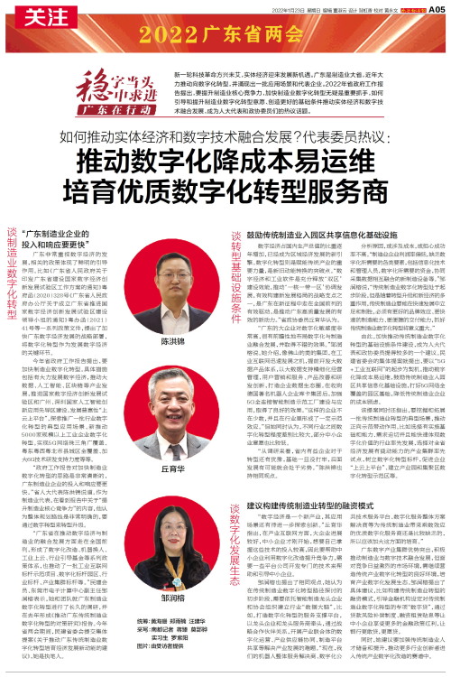 新一轮科技革命方兴未艾,实体经济迎来发展新机遇。广东是制造业大省,近年大力推动向数字化转型,并涌现出一批应用场景和代表企业。2022年省政府工作报告提出,要提升制造业核心竞争力,加快制造业数字化转