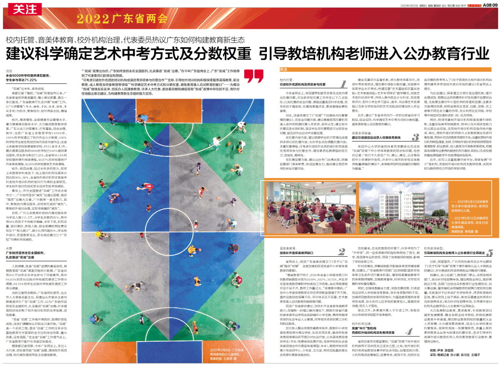 “‘双减’政策出台后,广东始终坚持走在全国前列,扎实推进‘双减’治理。”在今年广东省两会上,广东“双减”工作就得到了代表委员们的肯定和赞扬。 “可考虑引进校外优质的培训机构或是优秀师资参与托管合
