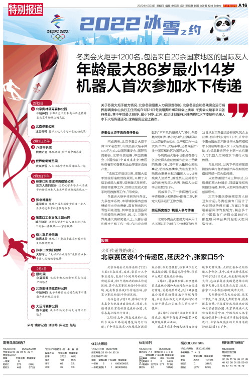 关于冬奥火炬手接力情况,北京冬奥组委人力资源部部长、北京冬奥会和冬残奥会运行指挥部调度中心执行主任闫成在1月21日冬奥组委新闻吹风会上表示,冬奥会火炬手来自各行各业,其中年龄最大86岁、最小14岁