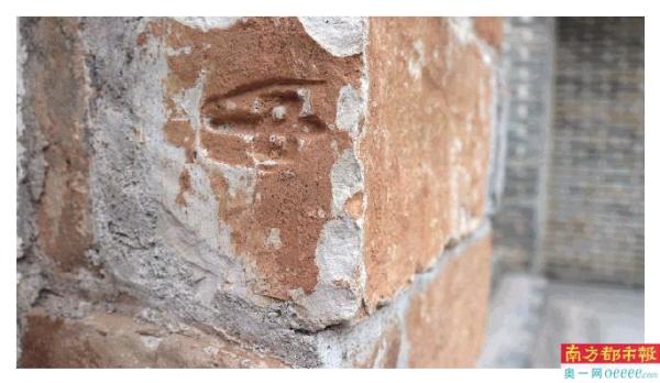 中心小学操场边有两根由城墙砖砌成的石柱,图为“中”字款城墙砖。