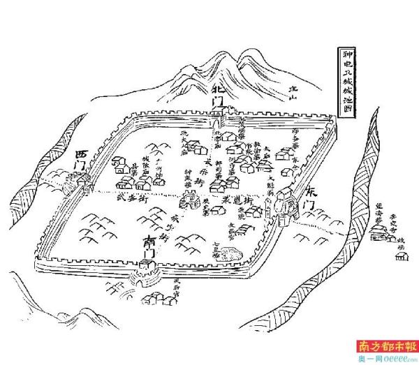 据张永忠介绍,神电卫城在当地被称为“电城”。电城目前保持神电卫城原来的面积不变,但城墙一部分在抗日战争期间被日寇飞机炸毁,另一部分为了便于群众逃避空袭而拆低。战争胜利后,城墙被削低改为环城公路。至于城墙砖的下落,他卖了个关子。幸运的是,城内仍保持东、南、西、北呈“十”字形的四条主要街道。虽然现在大家习惯称为“东街、南街、西街、北街”,但老一辈人还会清晰记得,当年斗大的字刻在四门的城楼上:东门叫做“承恩”,西门叫做“武安”,南门叫做“永宁”,北门叫做“长乐”。