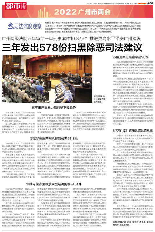 南都讯 五年审结一审刑事案件10.3万件,判处罪犯13.3万人;打响广东省扫黑除恶第一枪,广州市中级人民法院(以下简称“广州中院”)刑一庭获评广东省扫黑除恶专项斗争先进集体;刑事案件认罪认罚从宽制
