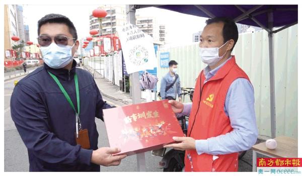 “礼盒24号下午就送到了工作站,里面有春联、购物袋、口罩,我们看了,很漂亮也实用。”邹添文告诉记者,春节即将到来,礼盒也代表了一份新春的祝福。邹添文和工作人员来到布吉农批市场的防疫卡点和小区出入口,为这里值守的工作人员送上新春祝福。随后,又为居住在翠苑楼的两户重点关爱家庭送去礼盒。
