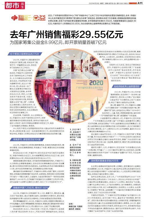 近日,广州市福利彩票发行中心(下称“市福彩中心”)公布了2021年全市福利彩票发行销售情况。去年,市福彩中心扎实开展党史学习教育和“我为群众办实事”实践活动,坚持稳中求进工作总基调,统筹推进疫情防