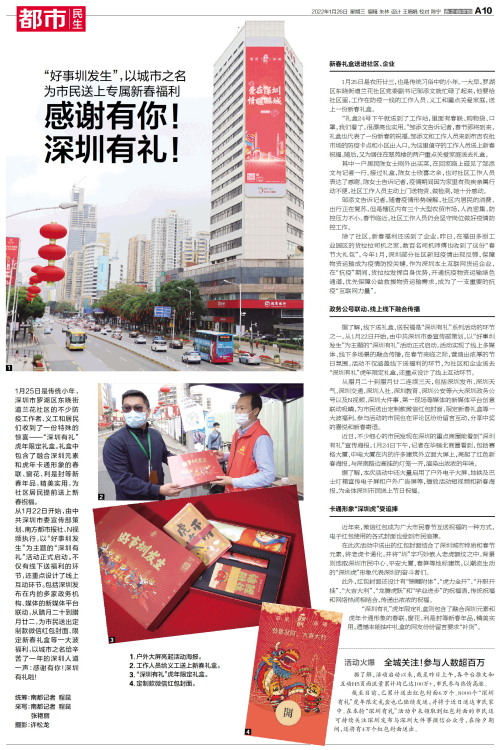 1月25日是传统小年,深圳市罗湖区东晓街道兰花社区的不少防疫工作者、义工和居民们收到了一份特殊的惊喜——“深圳有礼”虎年限定礼盒。礼盒中包含了融合深圳元素和虎年卡通形象的春联、窗花、利是封等新春年