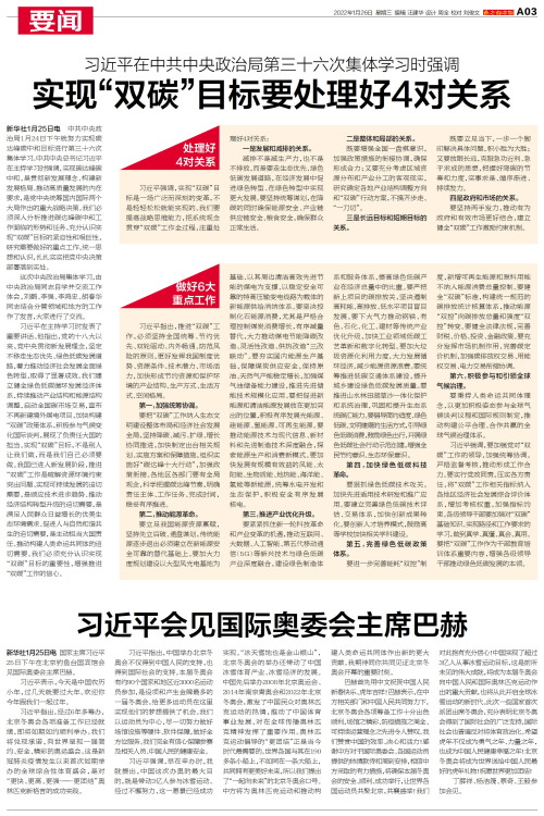 新华社1月25日电 中共中央政治局1月24日下午就努力实现碳达峰碳中和目标进行第三十六次集体学习。中共中央总书记习近平在主持学习时强调,实现碳达峰碳中和,是贯彻新发展理念、构建新发展格局、推动高质
