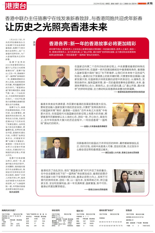 1月26日17时,中央政府驻港联络办主任骆惠宁在线发表新春致辞,骆惠宁代表中联办全体同仁,给广大香港市民拜早年,与广大香港同胞共迎虎年新春。 骆惠宁发表的2022年新春贺词的主题为“让历史之光照