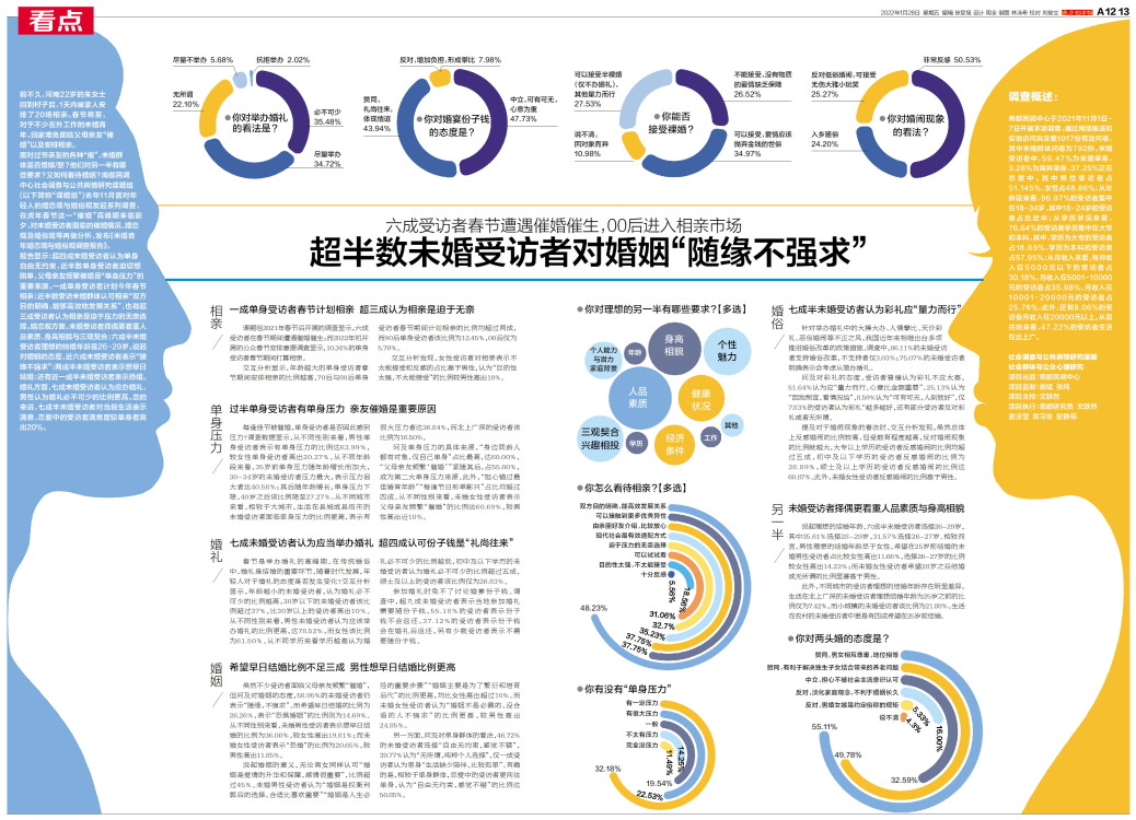 前不久,河南22岁的朱女士回到村子后,1天内被家人安排了20场相亲。春节将至,对于不少在外工作的未婚青年,回家难免面临父母亲友“催婚”以及安排相亲。面对过节亲友的各种“催”,未婚群体是否恨嫁/娶?