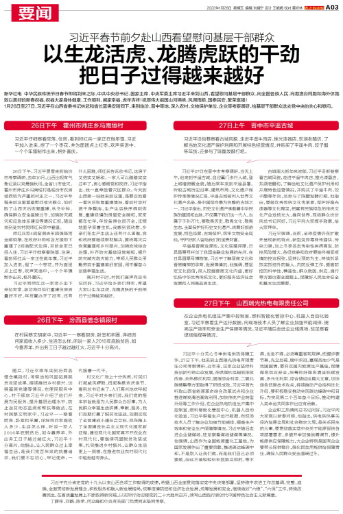 新华社电 中华民族传统节日春节即将到来之际,中共中央总书记、国家主席、中央军委主席习近平来到山西,看望慰问基层干部群众,向全国各族人民、向港澳台同胞和海外侨胞致以美好的新春祝福,祝福大家身体健康、